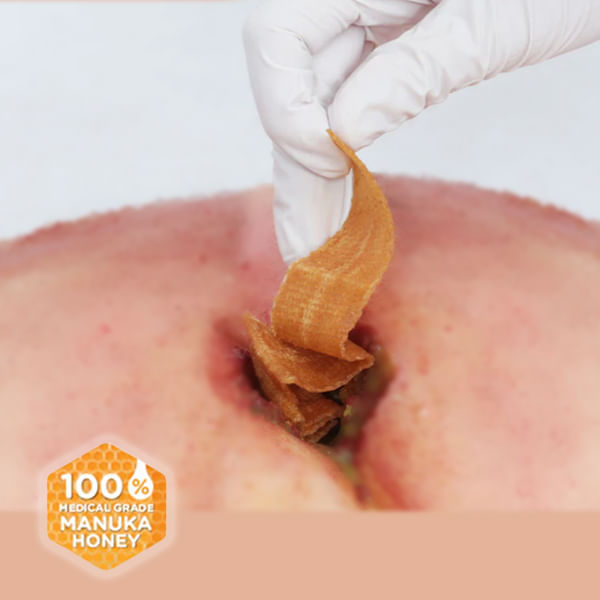 As tiras Ribbon de alginato de cálcio reforçado, são esterilizadas, não aderentes, impregnadas com mel medicinal de Manuka, com propriedades antibacterianas.