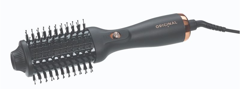 Escova elétrica com cilindro térmico oval para distribuir o calor uniformemente. 2 tipos de pontas para prender, desembaraçar e alisar o cabelo. 3 posições: frio/baixo/alto.