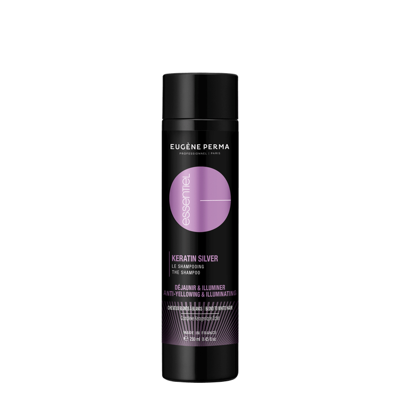 O champô azul neutraliza os reflexos amarelos, para todos os louros e brancos. O Champô Keratin Silver Essential é o champô essencial para neutralizar os reflexos amarelos indesejados. Clareia e ilumina os cabelos louros naturais, com madeixas ou descolorados, bem como os cabelos brancos. Este champô contém o Keragenic Radiance Complex: um complexo exclusivo derivado da queratina que reestrutura e regenera a estrutura interna do cabelo. Um verdadeiro elixir da juventude, mantém a força e o brilho do cabelo. O complexo de brilho com queratina, contendo colorações corretivas, reaviva os reflexos prateados, reestrutura e protege o cabelo, neutralizando o amarelecimento.