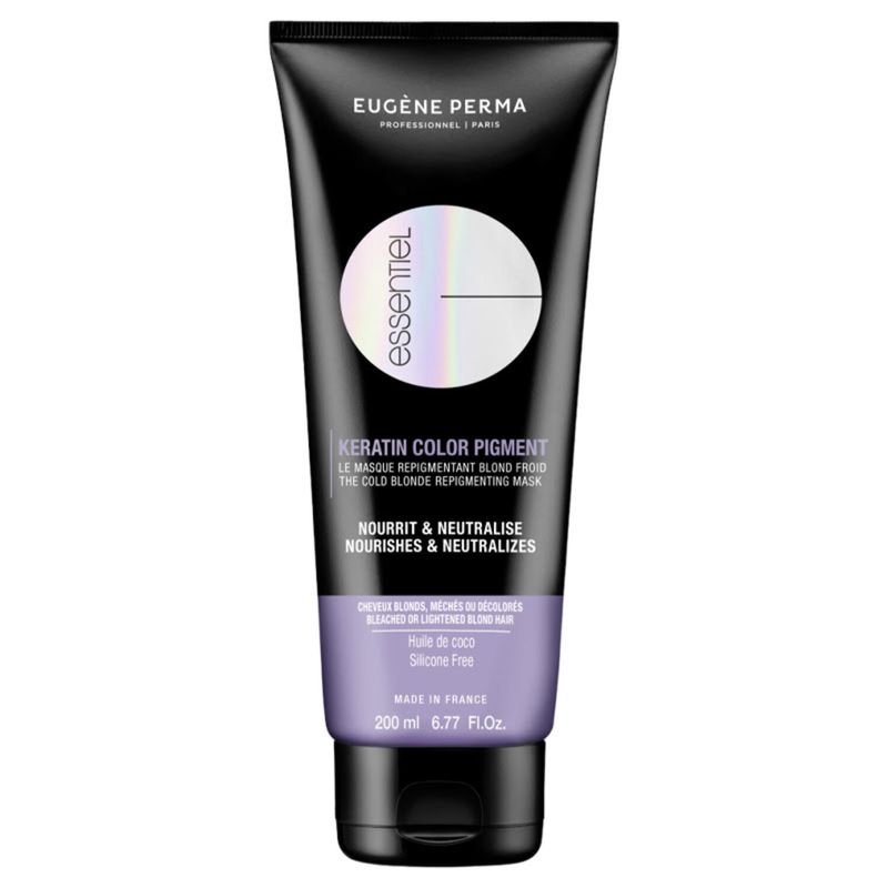 Máscara Neutralizante de Tons Amarelos para Cabelos Loiros Naturais, com Madeixas, Descolorados ou Grisalhos. A Máscara Repigmentante Essentiel KERATIN COLOR PIGMENT Bege Blonde neutraliza os tons indesejados desde a primeira utilização e prolonga o brilho do cabelo loiro. Os cabelos loiros são realçados, recuperando o brilho e a intensidade dos primeiros dias. A fórmula, enriquecida com queratina e óleo de coco, fortalece a fibra capilar e nutre o cabelo sem pesar.