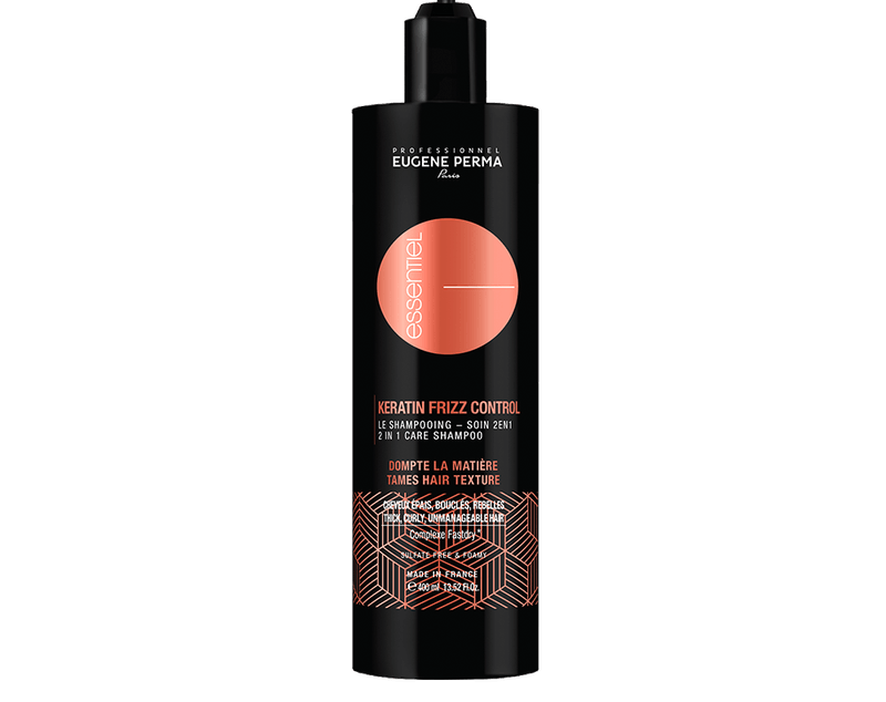 Champô e condicionador 2 em 1 para cabelos grossos, encaracolados e rebeldes. O champô Keratin Frizz ESSENTIEL é um champô de cuidado 2 em 1 que proporciona uma limpeza profunda e amaciamento para cabelos encaracolados. Disciplina os fios e protege-os dos danos ambientais. Este champô contém o complexo Keraction (uma combinação de nutrientes essenciais e proteínas de queratina vegetal para fortalecer o cabelo, prevenir a quebra e adicionar suavidade e brilho aos comprimentos) e o complexo FASTDRY (secagem rápida): agentes disciplinadores que retiram a água da fibra capilar para acelerar a secagem.