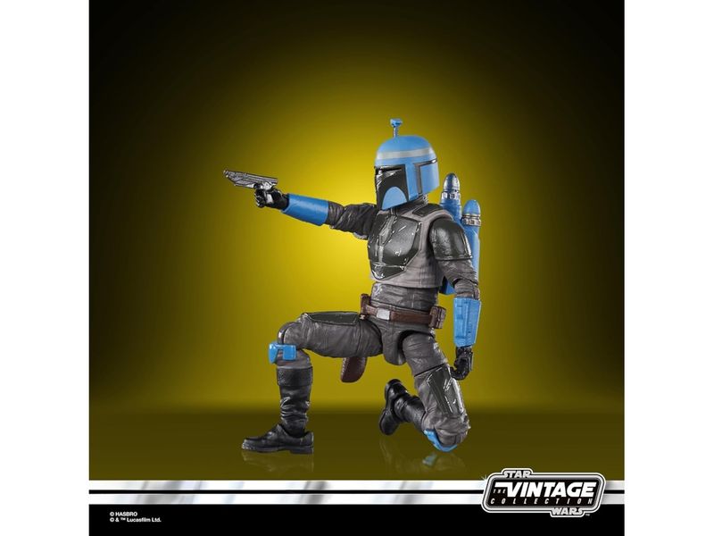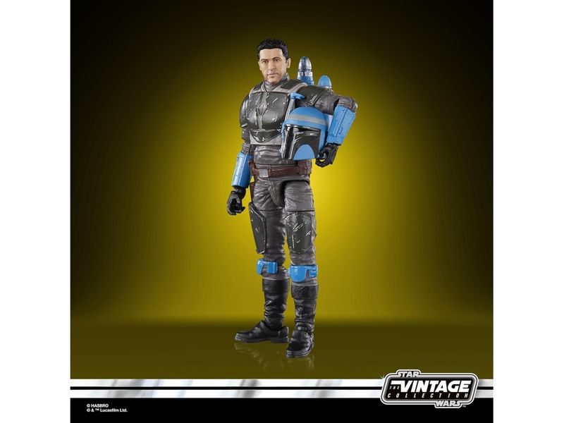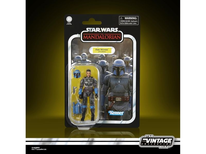 A figura da versão Axe Woves Privateer de 9,5 cm apresenta armadura Mandaloriana detalhada com cores personalizadas e trajes de batalha. Inclui capacete, blaster e jetpack, refletindo seu papel como mercenário. É uma criação da Hasbro e Kenner para a Linha Vintage Collection, e é inspirada na versão do personagem que aparece na série do Disney+ “The Mandalorian”, criada por Jon Favreau e Dave Filoni. Ele vem no clássico blister preto.