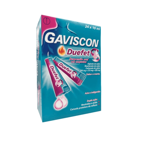 Gaviscon Duefet tem dupla ação no alívio rápido da Azia e Indigestão. Além do icónico ingrediente comum a toda a gama Gaviscon, alginato de sódio, a sua composição difere da gama Gaviscon no carbonato de cálcio, apresentando o dobro da quantidade deste antiácido.