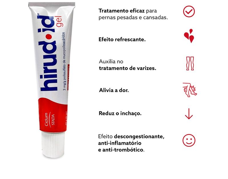 Hirudoid® Gel tem efeito refrescante proporcionando alívio das pernas cansadas e pesadas. Com propriedades anti-inflamatórias e efeito anti-trombóticas atuando eficazmente em contusões, distensões e nódoas negras promovendo a regeneração do tecido conjuntivo. Acelera a reabsorção dos hematomas e edemas. Tratamento sintomático adjuvante de distúrbios venosos superficiais, síndrome varicoso, hematoma, distensões, contusões. O Hirudoid® gel está particularmente indicado sempre que a massagem não é possível ou aconselhável.