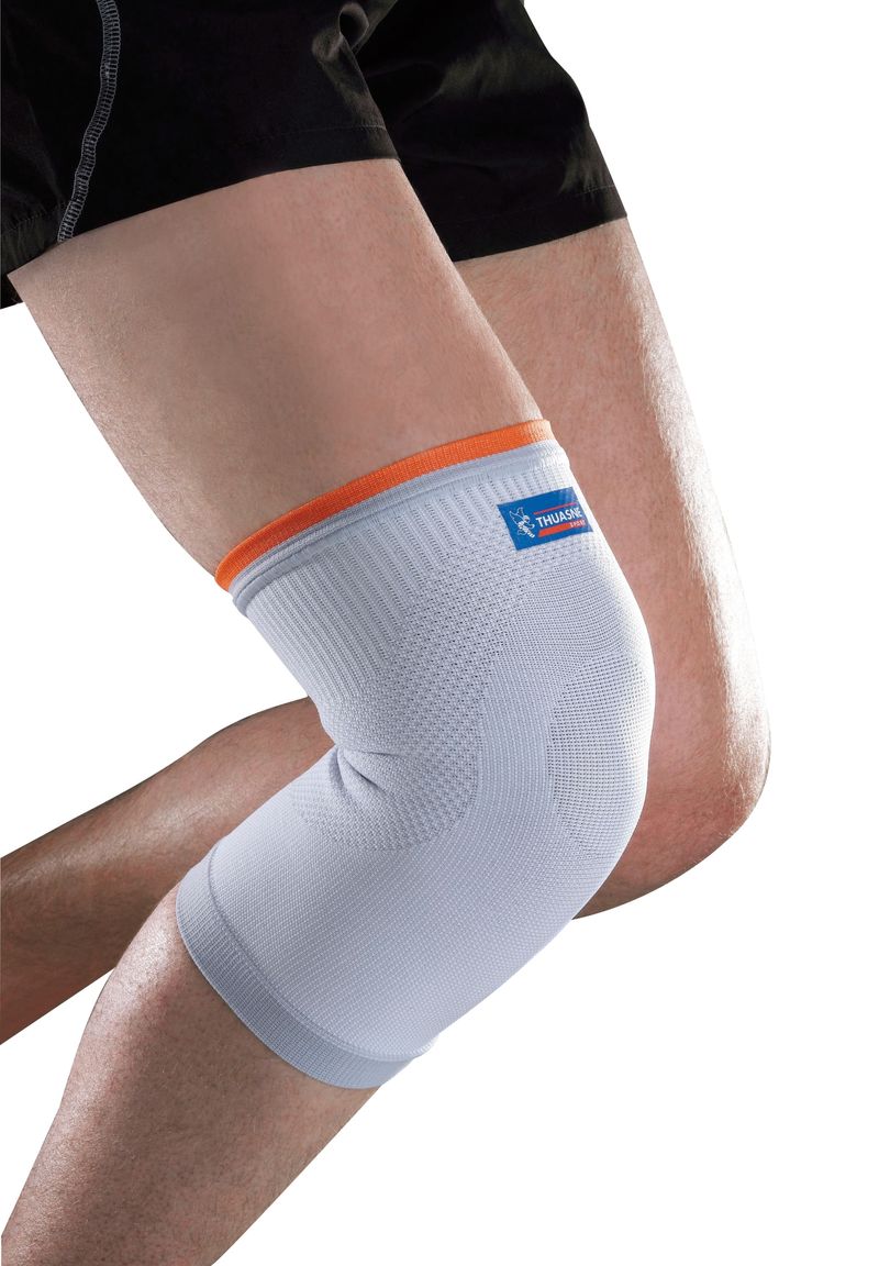 Joelheira com malha elástica que exerce uma pressão uniforme sobre o joelho.