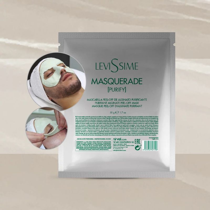 Masquerade Purify: Máscara purificante de alginato formulada com algas castanhas e extrato de pepino que proporciona um efeito refrescante, remove as impurezas e estimula e revitaliza a pele. As máscaras peel-off de alginato são um tratamento de beleza que proporciona múltiplos benefícios para a pele do rosto e pescoço. Estas máscaras permanecem na pele durante aproximadamente 15 minutos para promover a penetração dos ingredientes ativos. A Masquerade by LeviSsime é formulada com os ingredientes ativos mais inovadores, predominantemente algas castanhas. A coleção é composta por quatro máscaras peel-off de alginato, cada uma com os seus próprios benefícios. Além disso, cada máscara apresenta-se num formato de dose única e é obtida através da mistura do conteúdo em pó com água até obter uma emulsão espessa.