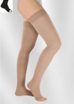 Meias de compressão até à coxa, com orla antidesliazante, biqueira aberta e compressão grau 2.