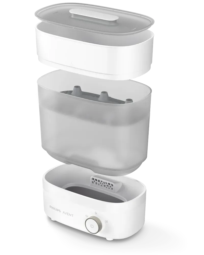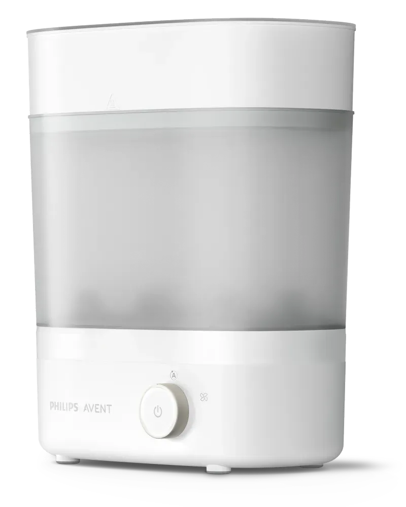 Esteja a postos para a próxima refeição do bebé em 40 minutos. O Esterilizador de biberões e o Secador de alta qualidade utiliza jatos de ar filtrado para secar os biberões antes de desligar. O esterilizador é rápido e higiénico, eliminando 99,9% dos germes* para maior tranquilidade em todas as refeições.