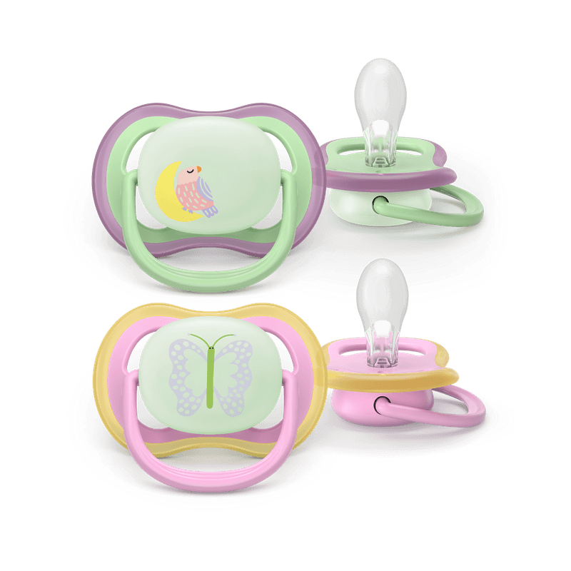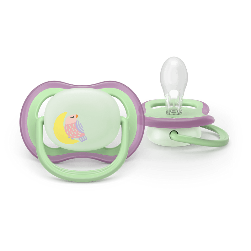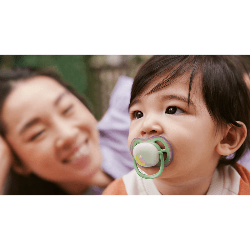 Calmante e respirável com orifícios amplos. 9 em cada 10 pais concordam: as chupetas Philips Avent Ultra Air são confortáveis para o meu bebé.** Além disso, brilham no escuro, por isso, o conforto e o alívio são sempre fáceis de encontrar. Agora com materiais 80% à base de plantas.*