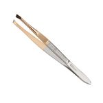 Pinça de precisão com ponta oblíqua dourada, ideal para remoção de pelos com facilidade e conforto. Compacta e ergonómica, perfeita para cuidados pessoais.