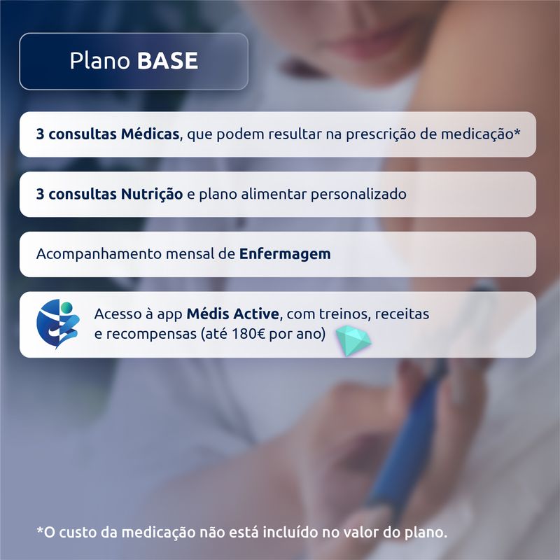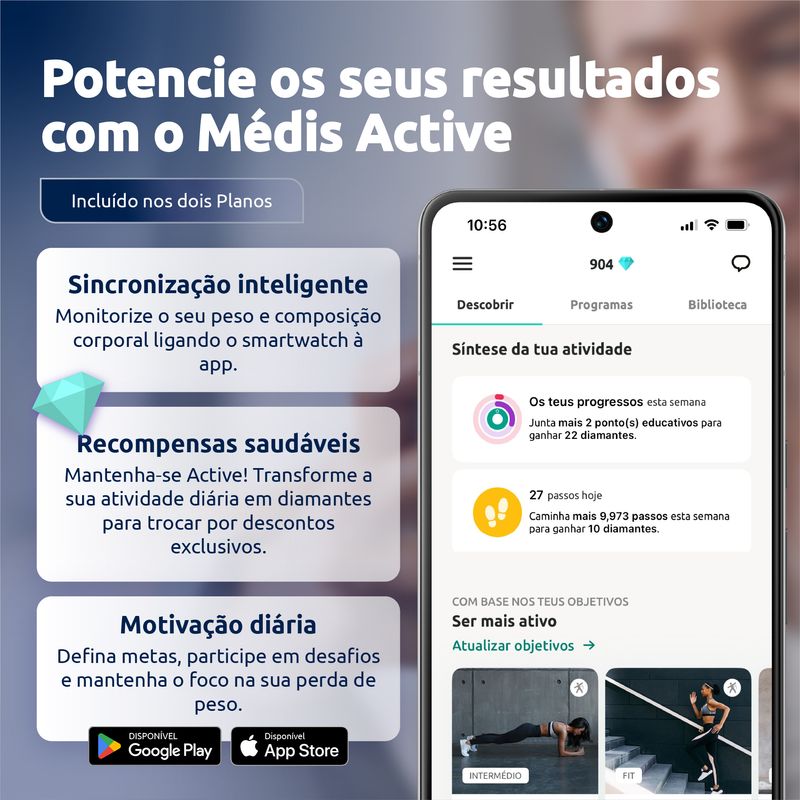 - Acesso à app Médis Active que o apoia no processo de emagrecimento e recompensa hábitos de vida saudáveis. Aceda a centenas de conteúdos de nutrição, atividade desportiva, sono e muito mais, e ganhe recompensas no valor de até 180€ por ano.