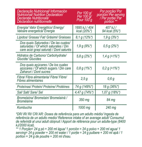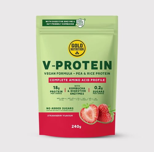 A V-Protein é uma proteína vegetal, ideal para complementar a ingestão de proteína e para a manutenção de massa muscular. É a alternativa vegetal para o teu consumo de proteína, sendo composta apenas por proteína de ervilha e de arroz, o que permite que a sua composição inclua todos os aminoácidos essenciais para o organismo, sem adição de açúcares. Além disso, agora contém kombucha, que é rica em probióticos e contribui para a saúde intestinal.