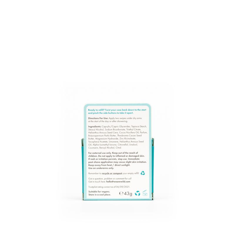 WILD, desodorizante natural, sem alumínio, 100% vegan e recarregável. Recarga com aroma de Algodão Fresco e Sal Marinho. Reinventa a tua experiência no cuidado pessoal com os desodorizantes naturais WILD