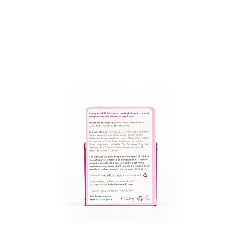 WILD, desodorizante natural, sem alumínio, 100% vegan e recarregável. Recarga com aroma de Coco e Baunilha. Reinventa a tua experiência no cuidado pessoal com os desodorizantes naturais WILD