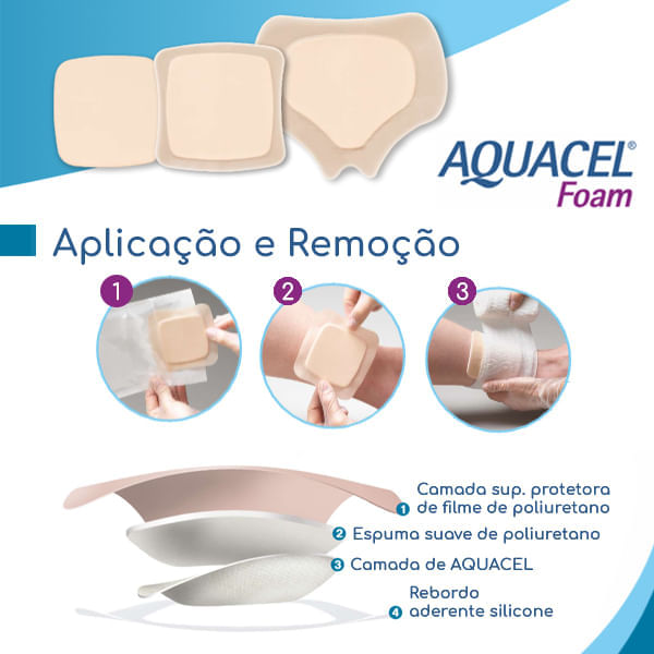Penso em espuma com uma camada de AQUACEL que lhe oferece conforto, entre outros benefícios para a cicatrização.