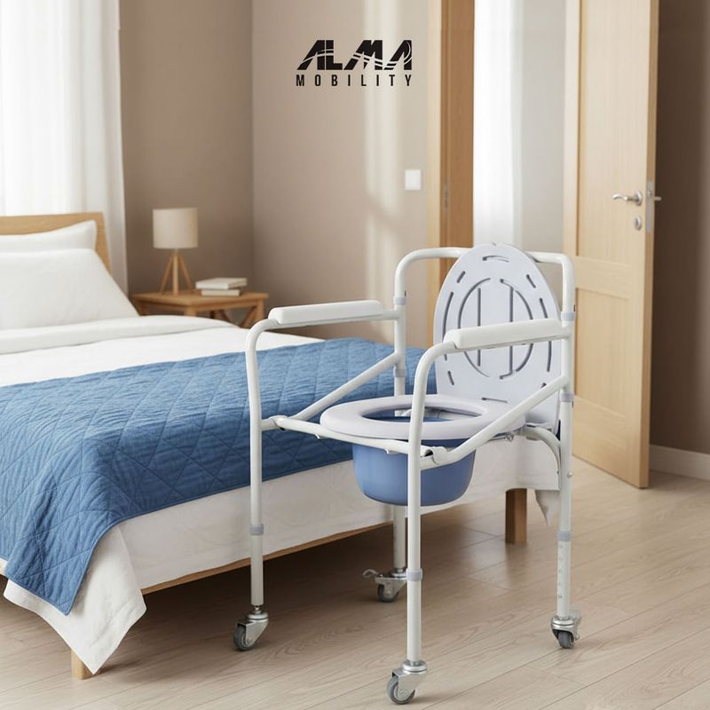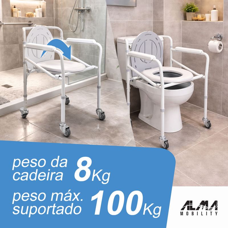 Cadeira sanitária com rodas, adaptável para banho ou como alteador de sanita. Versátil, segura e prática. Um apoio essencial para cuidados do dia a dia. Marca: Alma Mobility