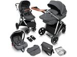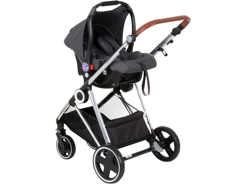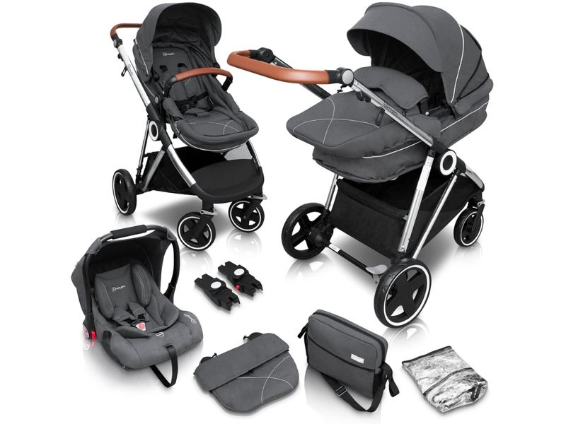 Descrição do produto O carrinho de bebé Halime Pram da babyGo é um carrinho de bebé 3 em 1 moderno, com vantagens práticas e elevados padrões de segurança. Como carrinho multifuncional, o carrinho de bebé da babyGo pode ser combinado com a alcofa para recém-nascidos, o assento desportivo e também com uma cadeira auto. O carrinho de bebé pode transportar uma carga até 15 kg e é adequado para crianças até cerca de 36 meses de idade. Os arneses de segurança, as barras, as ombreiras e os extras úteis, como a capota de proteção solar, aumentam a segurança e o conforto. As compras, os sacos de fraldas e outros objectos podem ser guardados no cesto de arrumação. O carrinho de bebé babyGo pode ser dobrado rápida e facilmente, o que o torna particularmente fácil de guardar e poupar espaço. Com pouco esforço, o assento do carrinho de bebé pode ser ajustado para ficar virado para a direção da viagem ou vice-versa. Isto permite ao bebé explorar o mundo ou desfrutar da proximidade da mãe ou do pai no campo de visão direto. Graças às rodas com função giratória, o carrinho de passeio é flexível e muito fácil de conduzir. O carrinho de bebé Halime, com o seu design moderno, está disponível nas cores baloo, cinzento e antracite e foi produzido pela babyGo com grande atenção aos pormenores e com os mais elevados padrões de qualidade. Caraterísticas especiais - adequado desde o nascimento - assento regulável - design moderno - rodas giratórias flexíveis Dados técnicos - Dimensões do carrinho de bebé 95 cm de comprimento, 60 cm de largura x 107 cm de altura - Peso 12,8 kg