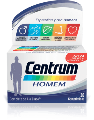 Suplemento alimentar com uma fórmula especificamente equilibrada com quantidades reforçadas de vitaminas e minerais que ajudam a satisfazer as necessidades específicas dos homens. Centrum Homem Comprimidos é um suplemento alimentar multivitamínico, que apresenta uma fórmula especialmente equilibrada para complementar a alimentação, satisfazendo as necessidades de vitaminas e minerais de homens adultos. Contém quantidades reforçadas de algumas vitaminas do Complexo B e de minerais como o Cálcio e o Magnésio, que têm um papel importante na conversão metabólica das proteínas, lípidos e hidratos de carbono em energia. Apresenta um reforço significativo do teor de vitamina C, que em conjunto com os minerais como o Cobre, o Selénio e o Zinco, contribuem para o normal funcionamento do sistema imunitário. Tem um teor de Magnésio reforçado contribuindo para o normal funcionamento dos sistemas nervoso e muscular, ajudando a transmitir os impulsos entre as células nervosas e musculares. Também contém Cálcio e Vitamina D, que contribuem também para o normal.