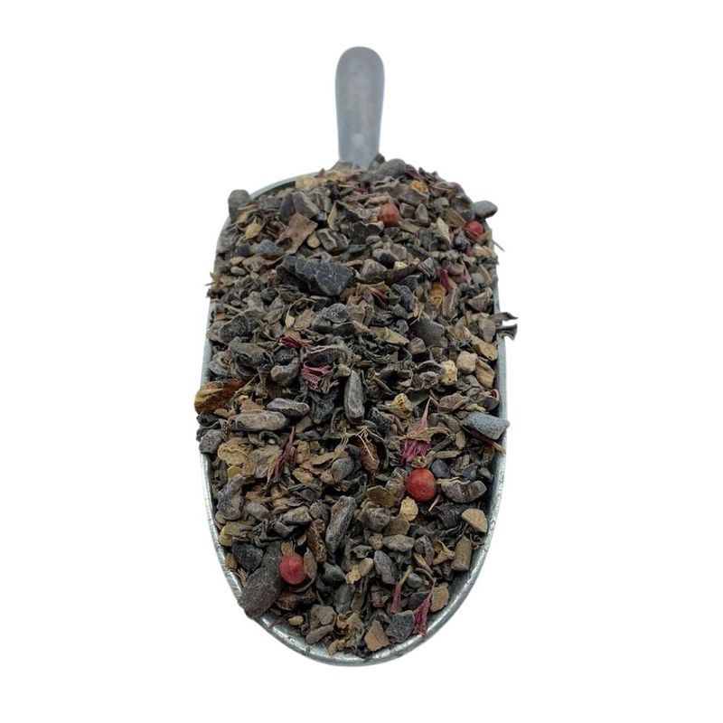 1 unidade = 50gr Uma mistura de grãos de cacau torrados, especiarias (cardamomo, gengibre, canela) e chá preto com laranja. Todos os nossos produtos são biológicos certificados e vendidos a granel – para que possa comprar a quantidade exata de que necessita. Os produtos são expedidos em sacos de papel reciclado ou sacos compostáveis, seguindo em caixas reutilizadas.