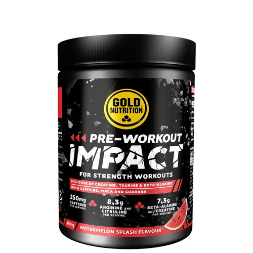 Pre-workout Impact GoldNutrition® é uma fórmula que vai promover a força explosiva, o crescimento da massa muscular, o aumento energético, e ao mesmo tempo atrasa a instalação de fadiga e facilita a recuperação e regeneração muscular. O que o diferencia dos restantes pré-treinos é o seguinte: - Quantidades mais eficientes estudadas de cada um dos ingredientes; - O facto da cafeína ser extraída dos grão de café ( mais natural do que a cafeína anidra de génese sintética); - Para além da cafeína, as suas propriedades energizantes devem-se também à maca e ao guaraná.
