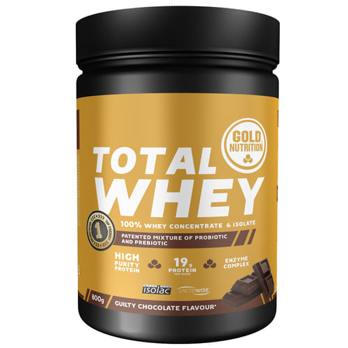 Total Whey mais Gold, agora com uma fórmula melhorada e reforçada com : Lactowise®, Lactase, Papaína e Bromelaína, que melhoram ainda mais a digestão e absorção. Total Whey é indicado para obter uma definição muscular perfeita, travar a degradação e manter a massa muscular, conseguir um crescimento saudável, fortalecer o sistema imunitário e acelerar a recuperação. Com um baixo teor de gordura e uma concentração reduzida de hidratos de carbono, Total Whey Goldnutrition contém proteínas de altíssimo valor biológico que substituem a carne, o peixe e os ovos. Em planos de dieta é um excelente substituto de refeição.