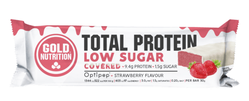 Total Protein Low Sugar Covered Morango Chocolate é uma barra hiperproteica, onde destacamos a inclusão de OPTIPEP® 4Bars (hidrolisado de proteína concentrada do soro do leite) que lhe confere uma melhor textura e sabor tendo uma absorção mais rápida e melhor digestibilidade